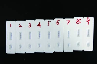 9个样品检测黄曲霉毒素B1,均呈阴性(出现两条红线),证明部符合标限量标准